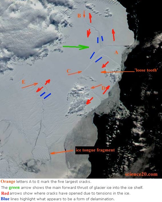 Cracks in the Amery Ice Shelf show a prominent zig-zag form. This is a type of crack which forms in a laminated material which is deformed under pressure. As the laminate is forced into a curve it tends to crack in a series of radial and lateral failures.