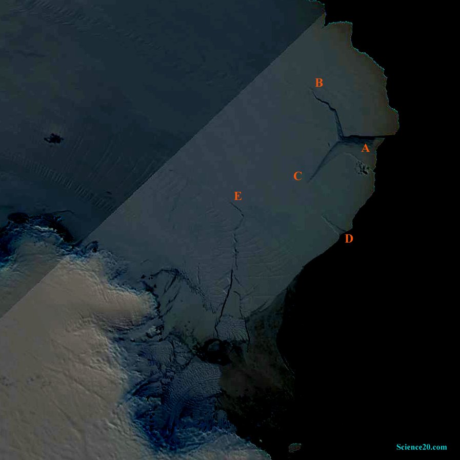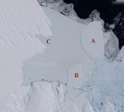 Another delamination mechanism may be called 'wedging'. It is often seen in sandstone that water seeping between the laminates will expand on freezing in winter and will force off fragments of stone. When water in a rift freezes it will tend to expand and widen the rift. Debris falling into the rift will obstruct any force tending to close it. Ice debris may be flushed further into a rift if it opens even a little, giving a 'ratcheting' effect to rift widening. A berg which is large in comparison with a rift may be so affected by wind and current that it acts as a giant wedge, adding its force to the other forces which cause or promote rifting. In the image above of the Amery zigzags an ice island is clearly seen to be wedging itself into the rift. The image below, circa 2009, from Google maps shows two ice islands A and B. Ice island B is the most likely source for the fragment which became wedged in the rift at C.