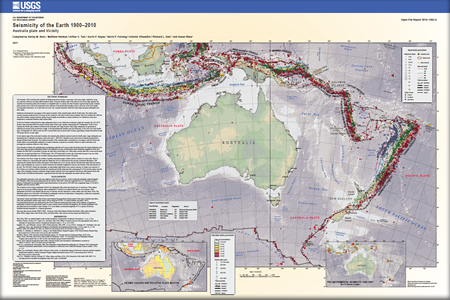 The local part of the Ring of Fire is quite evident in this map. Credit: USGS/Benz H.M., Herman, Matthew, Tarr, A.C., Hayes, G.P., Furlong, K.P., Villasenor, Antonio, Dart, R.L., and Rhea, Susan, 2011, Seismicity of the Earth 1900–2010 Australia plate and vicinity: U.S. Geological Survey Open-File Report 2010–1083-G, scale 1:15,000,000.