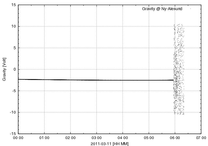 We say that the superconducting gravimeters are so sensitive to changes in gravity that if you choose to take a leak close by, the instrument will reveal your actions (your fluid adds weight to the local environment). Weather this is true or not has no bearing on the observations of the Tohoku earthquake. The signals were so powerful it knocked out the instrument after about 20 min (see graph below). After a short brake it was fully operational and was recording again. The gravitational signal of the earthquake reached Ny-Ålesund and the superconducting gravimeter approximately 10 min the event in japan.Seen above the very instrument, super conducting gravimeter in Ny-Ålesund, Svalbard, Norway, that measured the Tohoku-oki earthquake in Japan. Credit: Ove Christian Dahl Omang.
