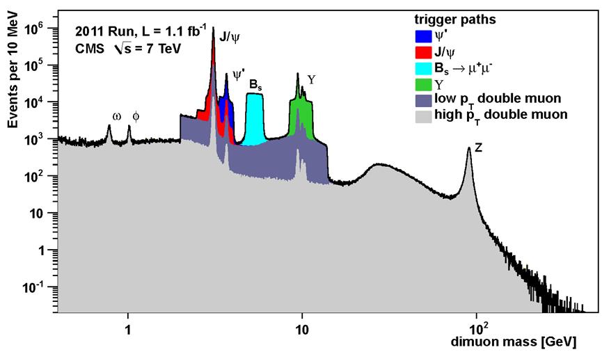 In this graph you see many peaks from dimuon resonances, all together in a wide mass spectrum encompassing from 0.2 to several hundred GeV. You can clearly see the omega, the phi, the J/Psi, the Psi(2S), the three Upsilon states, and the Z boson. Note that the grey histogram is the one resulting from the analysis of a single coherent trigger (high-pT dimuons), while other coloured stacked histograms refer to specialized triggers which add the acceptance to lower momentum muons. Also, there are many other features in the distribution which should be commented and explained. You can see two main "bumps", i.e. variations in the shape of the "background" from non-resonant dimuons. The origins are partly due to the trigger requirements (in particular the right bump at 20 GeV or so, which comes from the "turning on" of events where the two muons go into opposite emispheres, thus getting contribution from Drell-Yan processes) and to the heavy-flavour non-resonant contribution, which mostly yields high-pT muon pairs if these have small angle (and thus smallish total invariant mass).
