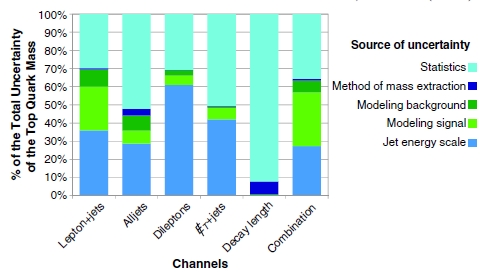 Anyway now let us go back to the actual measurement of the top quark, which is a combination of several different results obtained by the two collaborations from their analysis of about half the data they collected since the start of Run II at the Tevatron. If you ask whether they will one day add the rest of the data and produce a yet more precise number, my answer is "probably not". The reason is that it takes a lot of effort to produce these measurements, and the statistical uncertainty of each independent measurement is now generally not the limiting factor - systematic uncertainties have grown more important with the accumulation of data.