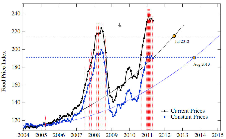 The complexity theorists in the paper state that food riots commonly occur above a threshold of the FAO price index of 210. That means persistent riots will begin in April, 2013 if current prices, adjusted for inflation, continue at current trends.