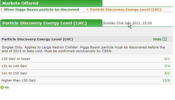 What do you see missing in there? A way to bet on if there is no Higgs found at all. Their disclaimer even says "Higgs Boson particle must eb (sic) discovered before the end of 2013 or bets void. Must be confirmed conclusively by CERN."
