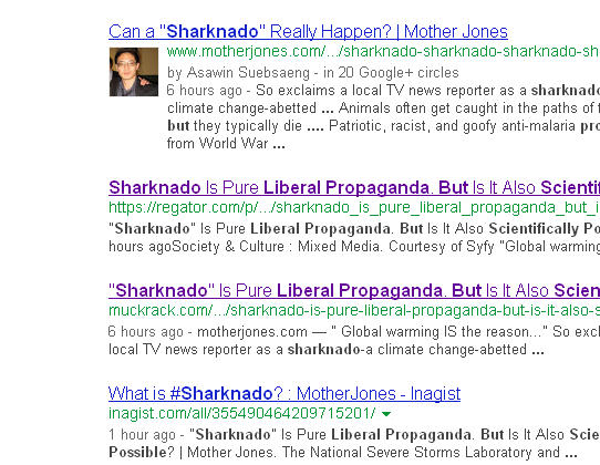 And she needs to be a little mean to get mentioned on Mother Jones un-ironically. Global warming is no laughing matter. If we don't switch to wind energy right now, a large chunk of their audience worries that man-eating sharks could wash up on shore due to a climate change-induced freak storm and eat LA hipsters. It's that serious.