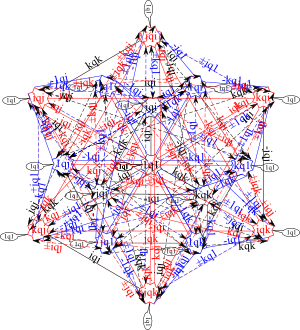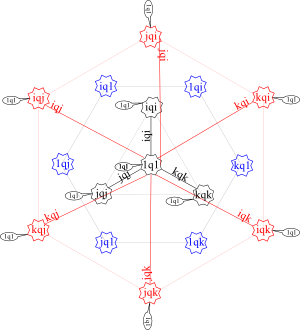 [Correction: David Halliday pointed out that an earlier version had solid lines, but the correct version needs to have the dashed lines to indicate the sign of the label changes depending on what the start vertex happens to be. Going out from the origin requires the positive label, while going in requires the negative one as happens with quaternions.]