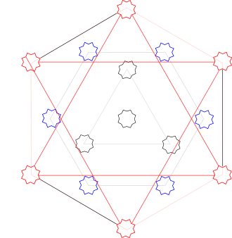 At dead center is the identity triple quaternion, 1q1. Surrounding that are the 3 diagonal gammas, always dressed formally in black. The inner blue ring of six are the 1-gammas because blue ribbons are given for first place. The outer ring are the red cross gammas.