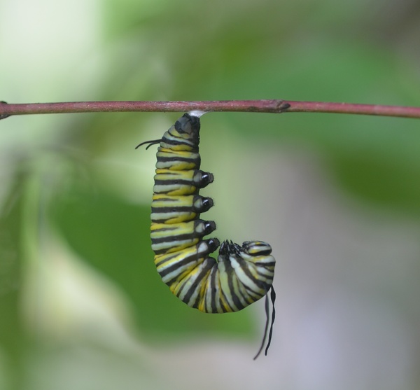 Monarch Butterfly (Danaus plexippus) larva preparing to pupate, or transform physically into a butterfly. This highly migratory species has declined across parts of its North American range in recent years. Matthew Moran, CC BY-ND