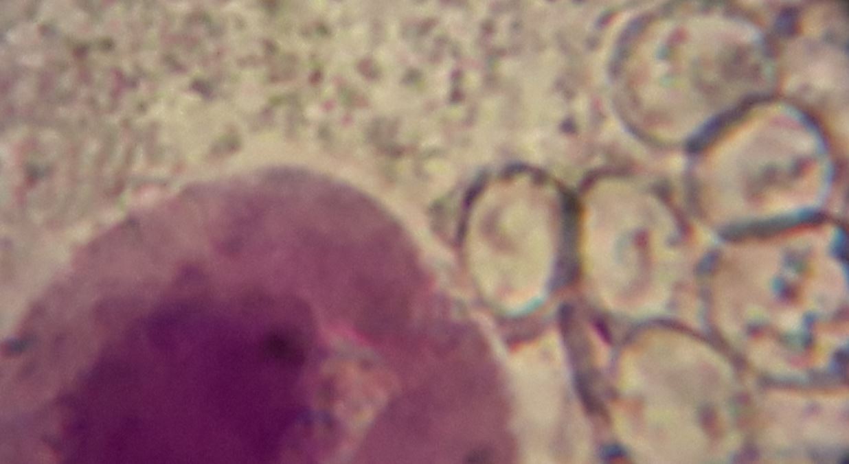 One cool thing is that the microscope allows to take footage with a PC, parfocal with the binocular eyepiece. I haven't purchased a PC adapter yet; I am actually not very interested to acquire images with it, and am happy with the cellphone shots one can take through the eyepiece. For instance, below is a pic of a sperm sample, coloured with eosin: