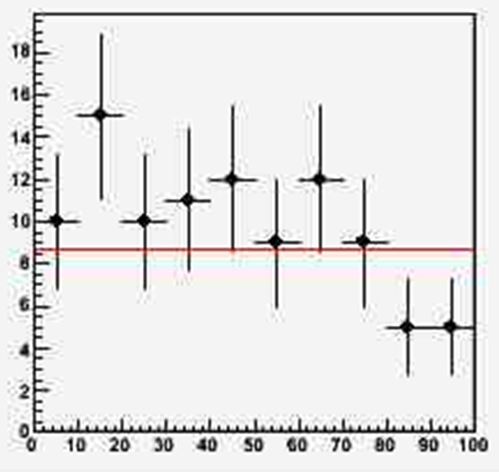 Let me give you the following example, which is taken from a lecture I give to graduate students in my course of Statistical data analaysis. Imagine you have data distributed in ten bins of some relevant variable, and you want to extract a guess of their underlying probability distribution - the model. In this very simple example the data are rather imprecise - as evidenced by the wide uncertainty bars. In this graph there is also plotted a red line showing a fit of the data to a constant, but ignore it for now.