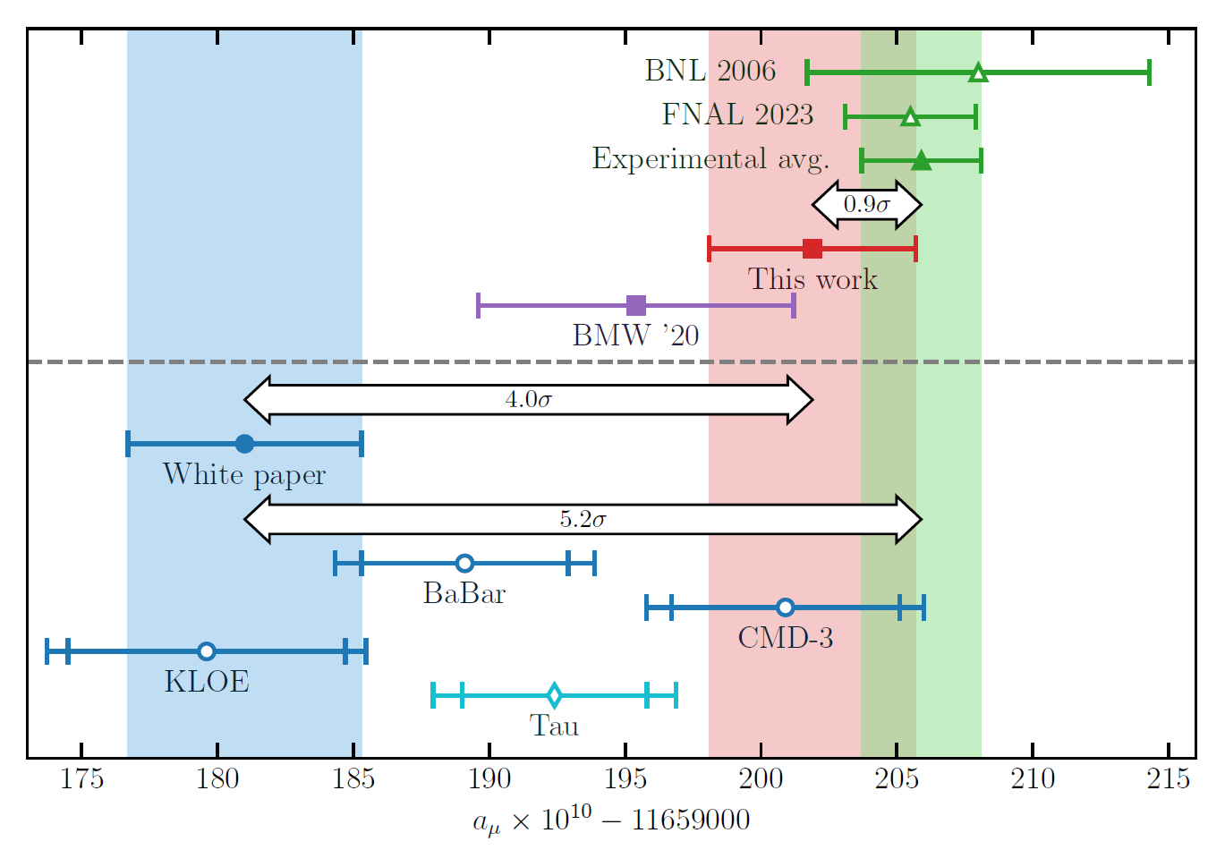 In this other even busier graph you can see the muon anomaly measurement (green bars at the top, and green band on the right) compared to various theoretical predictions. In red is the latest lattice QCD result. What is indicated as "white paper" (the blue band on the left) is the state of the art theoretical prediction not based on lattice QCD. Making reference to that result, which is believed to be correct by a good part of the community, forces you to conclude that there is a 5.2 standard deviation discrepancy with the experimental determination. However, if you believe in the lattice QCD calculation (red bar), the story is quite different!