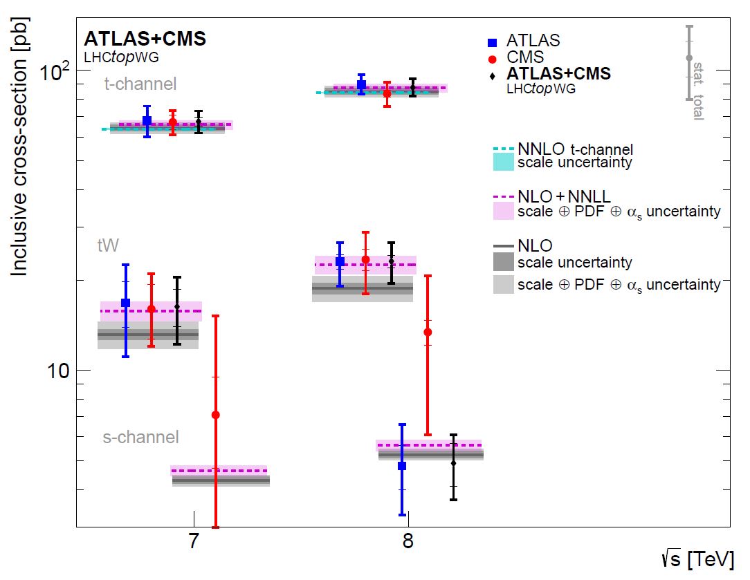In the graph, the x axis represents the energy of the proton-proton collision, on which the production rate depends (not very strongly however). On the y axis is shown the "inclusive cross section", a measurement of the probability to produce single tops by the labeleed mechanisms. The data (points with vertical bars) are compared to different theory estimates, that use different technologies to estimate the effect of subtle "subleading" quantum effects, so called "next-to-next-to-leading-order" corrections.