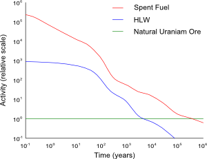 The main issue with the disposal of nuclear waste is its longevity. The diagram to the left shows the amount of time taken for HLW and spent fuel to decay to below the radioactivity of naturally occurring uranium ore (data for HLW here, for spent fuel here). Its radioactivity presents a danger to humans and other living beings, and therefore must be isolated from the biosphere until it decays to a safe activity level. Because this takes so long, conventional storage facilities are inadequate. Uncertainties about the future of society means that the maintenance these facilities require cannot be guaranteed, and dangerous radionuclides are likely to escape. Geological disposal, as outlined below, is designed to be passively safe; it will keep the waste contained even if left alone for thousands to millions of years.Most concepts involve a multi-barrier approach, where engineered barriers are combined with the surrounding geology to minimise the chance of the escape of any dangerous materials. Waste is first processed into a form that restricts the mobility of dangerous compounds. This often involves vitrifying it. The processed waste is then packed into containers and placed in the repository. The final layer of engineered barriers is the backfill used to fill some or all of the repository. Bentonite clay is often suggested, because of its very low permeability.
