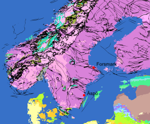 Sweden has one of the most advanced research programmes for the disposal of nuclear waste. Much of the research was done in situ in the underground Äspö Hard Rock Laboratory, however the final disposal of nuclear waste will occur in Forsmark (see map right, geology from OneGeology). They are both part of the Baltic Shield, which is dominated by mainly high-grade metamorphic and intrusive rocks. This was metamorphosed during Svecokarelian orogeny (mountain building event) in the Proterozoic (almost 2 billion years ago), although later orogens also had an affect.In Forsmark, there are four generations of fractures. These have been dated using cross-cutting relationships and Ar-Ar methods on the minerals that have precipitated along these fractures. The first generation formed close to 1.8–1.7 Ga, towards the end of the Svecokarelian orogony. The second were dated at about 1 Ga, during the early stages of the Sveconorwegian orogeny, while the third generation were dated at between 456–277 Ma. The final generation were much more recent, and sub-horizontal instead of the steeply dipping fractures of other generations. The origin of the final generation of fractures is thought to be glacial loading and unloading.